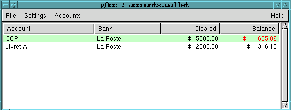 gAcc's layout is similar to that of GnuCash, with a main account list (see Figure 6) and separate ledger windows, but you can work with only one account at a time. gAcc is from Europe and offers better support for European dates and currency than the other programs I tested. You can set these options from the ``Preferences'' dialogs.