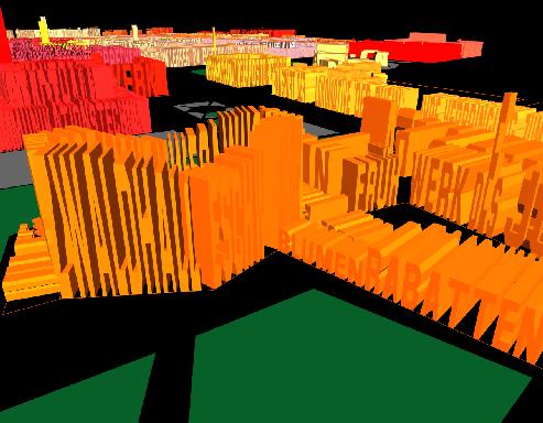 The 3-D text example is part of a real application--the ``Legible City II'', a multimedia artwork by Jeffrey Shaw (ZKM Germany). It uses the above technique to render three large cities (Amsterdam, Manhattan and Karlsruhe) of words (see Figure 3). To render a more game-like environment, the application callbacks will use the more traditional games techniques to render their objects (see Figure 4).