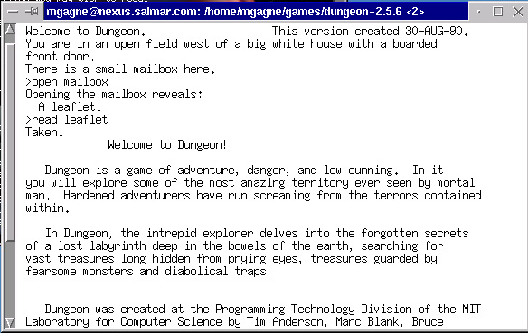 One game I highly recommend can be found in Metalab's textrpg directory. It is called simply dungeon. This game was originally written at MIT and is the predecessor of the now-legendary Zork games from Infocom (a company whose brilliant games stole a great deal of Chef Marcel's early years). The current version of dungeon is dungeon-2.5.6.tar.gz and comes in a pre-compiled ELF format. Simply extract the file into a directory and run it.