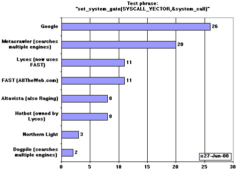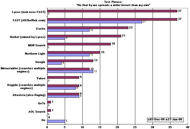 On December 3, 1999 and June 27, 2000, I tested fifteen of the most familiar search engines by searching for a relatively unique phrase: ``He that by me spreads a wider breast than my own'', which is part of a familiar line from Walt Whitman's Song of Myself. The phrase occurs far from the beginning of the work and can be found in many documents on the Web, including one on my own site, http://www.searls.com/.