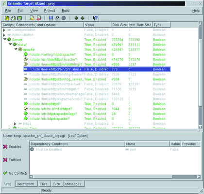 These screen shots show Lineo's tools at work, selectively enabling parts of both Linux and Apache.