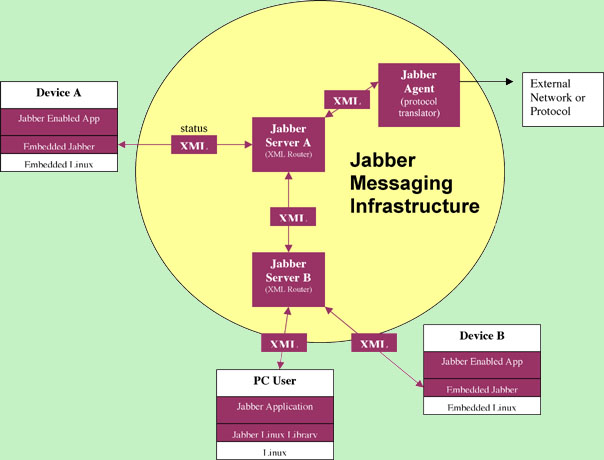 In this sense, Jabber is a ubiquitous XML router, streamlined for (and by) embedded Linux, or any other device-driving OS that supports XML-based messaging. Real (enough) time is the key. While e-mail is technically capable of routing XML documents, it lacks awareness of presence, which is key to Instant Messaging in general. This makes Jabber something of a new message transport breed.