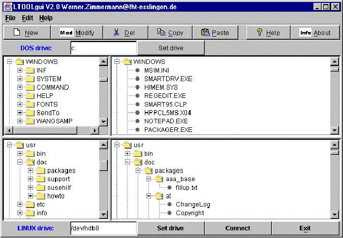 Some may feel that command-line programs are old-fashioned and ask, ``Where is the LTOOLS graphical user interface?'' Well, no problem: Use LTOOLgui. LTOOLgui, written in Java using JDK 2's Swing library, provides a Windows Explorer-like user interface (Figure 1). In two sub-windows, LTOOLgui shows your DOS/Windows and your Linux directory trees. Navigating can be done with the usual point-and-click actions. Copying files from Windows to Linux or vice versa can be done by copy-and-paste or by drag-and- drop. Clicking the right mouse button will open a dialog to view and modify file attributes like access rights, GID or UID. Double-clicking on a file will start it, if it is a Windows executable, or open it with its associated application. This even works with Linux files if they have a registered Windows application.
