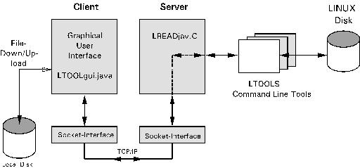 No doubt, any state-of-the-art program must be Internet aware. Well, if you run LREADjav on a remote computer and connect to it via LTOOLgui's connect button, you may access Linux files on this remote server as if they were local. LREADjav is a simple server dæmon, which translates requests, issued by LTOOLgui over TCP/IP, into LTOOLS command line program calls. The output of the command line programs is sent back via TCP/IP to LTOOLgui (see Figure 2). Of course, you can not only view directory listings, but also do everything remotely, that you can do locally, including file upload and download. The remote machine may run UNIX/Linux or Windows. At this point, this is more like a toy than a serious application, because LREADjav can pose security problems. In the default configuration, it can only be used from "localhost", but it can be configured to allow connections from three different remote clients. As they are identified via their IP address only, there is no password protection or the like. However, if a user has a serious need for that, he can easily implement a login/password scheme...it's all open source!