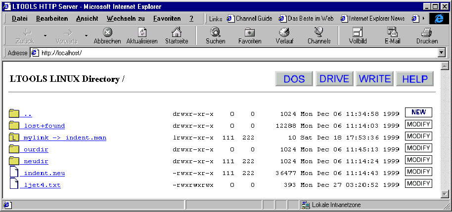 Maybe you don't have Java 2 installed. Well, no problem, as long as you have a web browser. Start LREADsrv and your web browser and as URL type http:localhost (see Figure 3). Now, your Linux directory listing should show up graphically in your web browser. LREADsrv is a small local web server, that, via a simple CGI-like interface, makes the LTOOLS accessible via HTTP-requests and converts their output dynamically into HTML pages (see Figure 4). Of course, not only does this provide local access, but it also allows remote access via the Internet. However, for remote users, LREADsrv does have the same low level of security as LREADjav.