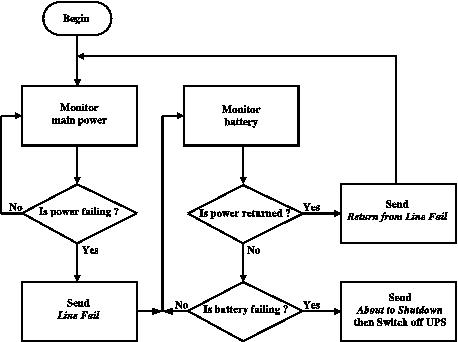 Now let's see the most important events at work. In Figure 1, the state machine of a UPS is described in a simplified form. When the utility power is present, the UPS monitors it for failures. If a failure is detected, the UPS sends a Line Fail alert to the computer and switches itself to battery power. At this time, the computer is powered by the UPS' battery. The UPS starts monitoring for battery power failures. If the utility power returns, the UPS sends a Return from Line Fail alert and switches back to utility power. If the battery power goes down, below a security level, the UPS sends an About to Shutdown alert and, after a defined amount of time, switches itself off.