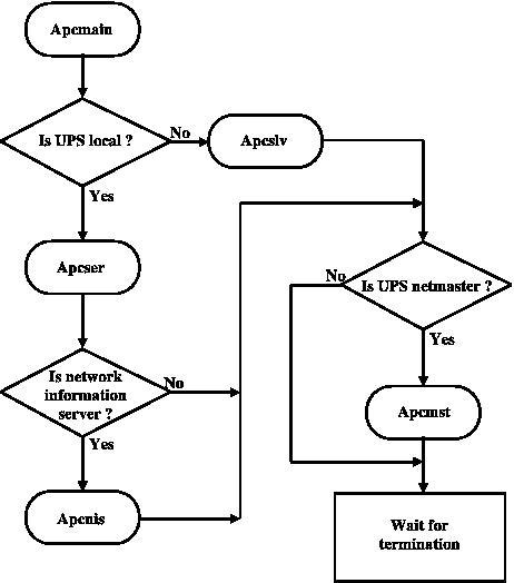 When apcupsd is run, it first initializes the serial port and tries to determine if there is a UPS connected. Once it finds a UPS, it spawns a number of child processes, each doing a specific task. This is a design decision, due to the number of things that apcupsd must do simultaneously.