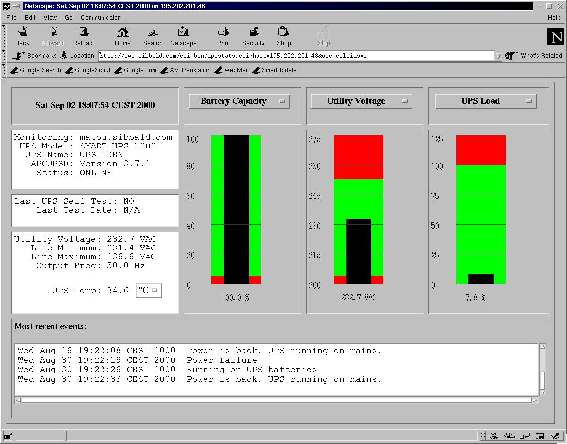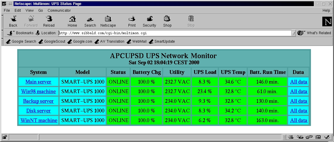 In Figure 4 another useful client for networked apcupsd is shown. It is the CGI interface that was integrated into apcupse and enhanced by Kern. If you want to be able to view UPS status from the Web, this is the best choice. Figure 5 shows the status of the UPSes connected to Kern's main server (http://www.sibbald.com/cgi-bin/multimon.cgi).