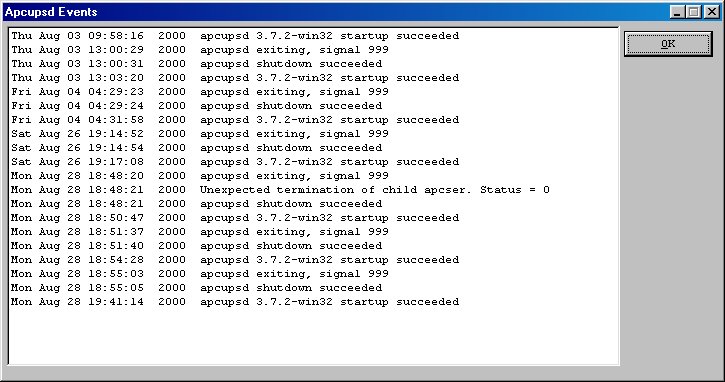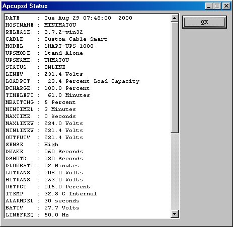 apcupsd is being ported to Win32 (9x and NT) by Kern. At the time of writing, Kern had produced a beta version of apcupsd for Windows. In Figures 6 and 7 apcupsd for Win32 status client is shown.