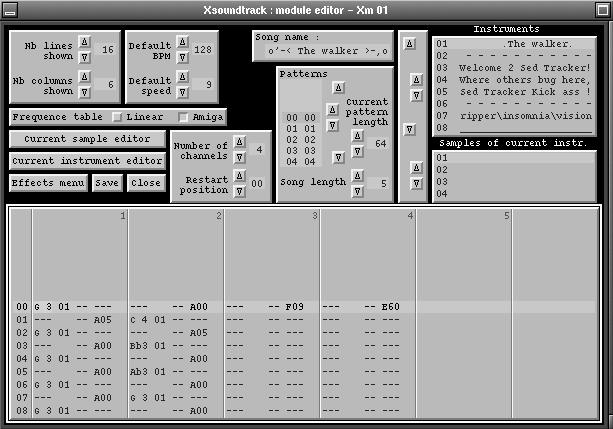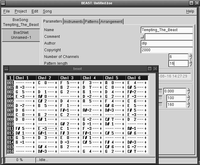 Tim Janik and Olaf Hoehmann have created the BEAST/BSE system which is an ambitious project that combines an audio synthesis network with a tracker's composition interface (see Figure 5). Currently, files are saved in the BSE format and are not compatible with mod trackers and players. Like Shake Tracker, BEAST/BSE is in early development, but it works and is already quite impressive.