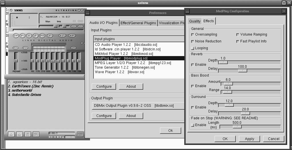 Mod players for Linux are also available in console and X interfaces. As noted earlier, almost every Linux distribution includes MikMod (see Figure 7), which is available in various incarnations (e.g., console, GTK, Qt, Xforms, and Java). The popular MODPlug player for Windows has been ported as a plug-in for the excellent XMMS player (see Figure 6) and is also the playback engine for Gmodplay.