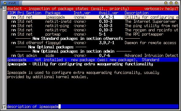 dselect is the granddaddy of the Debian frontends. As the first part of the installation process, it is the first thing new Debian users are greeted with, and it scares them. And it's true that dselect can be incredibly scary as well as incredibly dense. This section will be the short and sweet introduction to dselect. First, my best advice when using dselect is to read all of the on-screen help. Although not very user-friendly, everything you need to know is contained there.