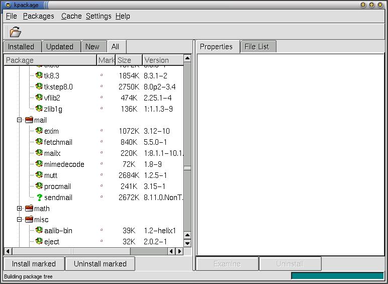 KPackage is the KDE package front end for both RPM and Deb. It uses a combination of tabbed and tree interfaces (see Figure 3), and the functionality is similar to gnome-apt. One of the cool features of Kpackage is that the dependencies are hyperlinks to the packages they reference. Kpackage also lists the files included in each installed archive and checks to make sure they all exist. It can be found at http://www.general.uwa.edu.au/u/toivo/kpackage/.