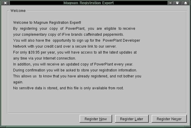 The installer--which must be run as root--starts with the registration screen. Registration is not compulsory unless you also subscribe to their update feature, in which case it just makes sense to register. There is a Never Register button that you can use and live happily ever after (see Figure 1); I have registered and haven't received any spam from them yet.