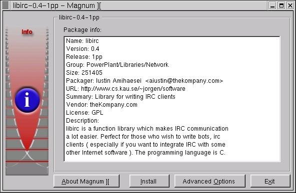 The mostly red PowerPlant box contains four CDs and a manual. The first CD has RPM versions of the included software, the second CD has Debian packages and the third CD has .tar.gz sources. The manual details their installation program, Magnum. Since I use Mandrake, I will include a short description of the RPM installer here.