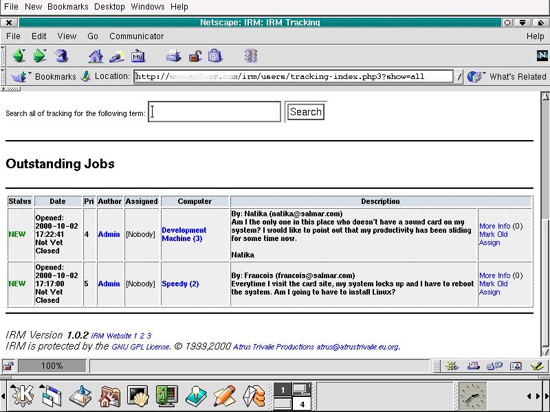The first recipe is something called IRM, which stands for Information Resource Manager. Written by Yann Ramin and Keith Schoenefeld, this package uses MySQL as its database. (You will need to be running an Apache web server with PHP4 extensions compiled in.) IRM is many things. First, it allows you to build a database of all the computers in your company or organization, organized in any way you see fit. This can include OS type, memory configuration, network card, IP addresses and more. There is also a separate list for network devices, hubs, cards and switches. Mais oui, you can add others as well. A similar function exists to record the software in your inventory (serial numbers, versions, etc.). You can then update the computer's profile by ``adding'' software so that when you click on that computer, it displays installed programs as well (useful when tracking licenses for that other OS).