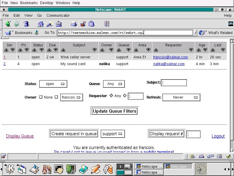 The next package I would like you to sample is called Request Tracker. Request Tracker is the brainchild of Jesse Vincent, who, along with his faithful helpers, Deborah Kaplan and Mary Alderdice, has created a great support desk system. Unlike IRM, Request Tracker steers away from the complete inventory management model and concentrates on the support queue. Essentially, it focuses on the life cycle of a problem as submitted to any support desk. Calls come in, get assigned, worked on, then resolved and closed.