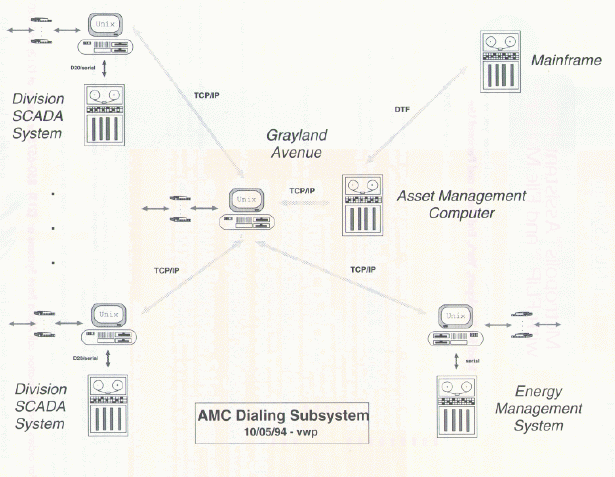 Gradually, the design of a new, distributed data gathering system took shape. We could install a PC in each of the division computer centers to receive the averaged analog data from the SCADA master computer and dial all of the field devices (meters, relays, etc.) in that division. A machine in our central office would receive a duplicate data feed from the division SCADA computers to provide data redundancy, and serve as a backup dialing system. All of these PC systems could be linked together over the corporate network with TCP/IP (except for Western division, where we could use UUCP). Vax connectivity was something of a problem, but we settled on a high-speed dedicated serial link with a simple file transfer protocol.