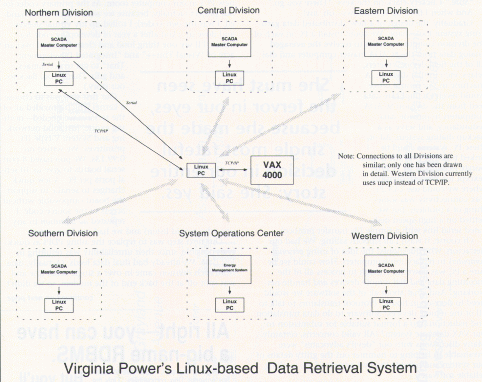 I'm a programmer for Virginia Power, an electric utility that serves about two million customers in much of Virginia and a small part of Northeastern North Carolina. Virginia Power's service territory is partitioned into five divisions: Northern, Southern, Eastern, Western, and Central. Among the responsibilities of the Operations Services group in which I work is the maintenance of a centralized archive database of 30-minute averages of all analog values which are retrieved by SCADA master computers located in each division. This averaged data is of great importance to system planners and load forecasters, and is vital when planning large construction projects which may cost millions of dollars. Processing all of this data is a demanding task, but Linux has saved the day.