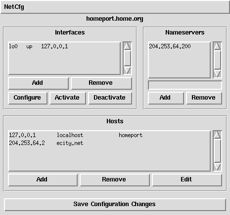 Some parts of this utility work, other parts don't. The Name Servers entry form doesn't work. Entering anything here causes an address of 0.0.0.0 to appear instead of the one you want. As you can see from the picture, I don't have much of a network. Just the loopback device. I believe that PPP is configurable under this utility, but I've not found the ways and means to do that.
