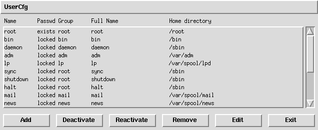 No surprises here folks. Configure both your users and groups with this utility. This is a nice utility and it takes some of the confusion and guess work out working with users and groups. I don't know of too many harried sys admins who have botched the users and groups files on occasion simply because they were in a hurry and didn't pay attention. This utility makes it easy to add, delete users and groups as well as changing passwords if the need arises.