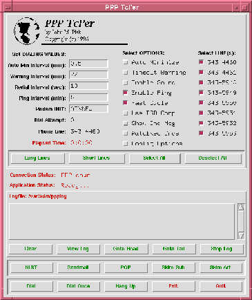 I have to admit, Tcl/Tk is just too much fun! Now, I'm not sure that I'd want to be building Lotus Smart Suite or Microsoft Office in Tcl/Tk, but for small project and programs this is just too much fun. What I wanted to do was to create a front end for pppd that I could use either as 'root' or as a user. I also wanted it to have a few little "extras" such as a timer, line selection, and logging facility. Well, it turned into a LOT of fun and after a bit of tinkering and pouring over John Ousterhout's and Brent Welch's books on Tcl/Tk programming, I finally got an admittedly alpha version up and running.