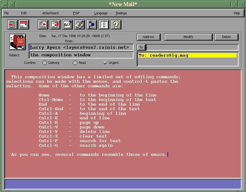Recently I did just that, and found that a new editing module had been contributed which really makes a difference in usage of the mailer. No longer is there a limit to the amount of the text in the editing window. This change, I believe, makes XFMail a credible choice as a Linux mail client.