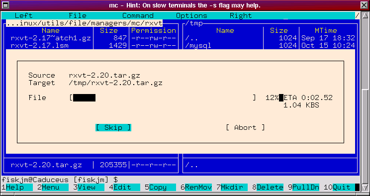 $ cd ftp://sunsite.unc.edu/pub/Linux/Incoming/The hintbar at the console or the title bar under X will display progress information (e.g., logging in, retrieving directory listings, and so forth). You can now view and copy files just as you would using ftp. On file transfer (use F5 to "Copy" the file to your local machine) a progress meter displays percent transfer completed, ETA (estimated time of arrival), transfer rate, and the now commonplace "stalled" flag. Use the Options->Virtual FS... menu item to customize the VFS features such as anonymous login name and so forth.