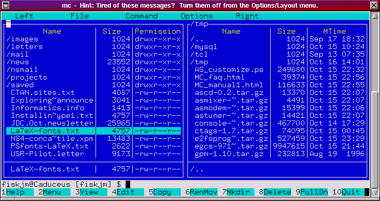 Also, while you are exploring, look through the Options menu for various items which will let you customize mc. Menus are a great place to poke around and see what facilities mc offers: most of the shortcut keystrokes I've mentioned are menu items (so you don't have to memorize the entire list of keystrokes!). For the adventurous:
