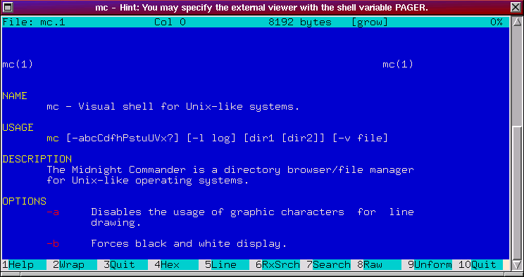 For example, to view a manual page (even a gzipped page!) simply select the file and hit F3. If you have the mc source distribution handy, change to the doc directory and select the mc.1 file. Hit F3 to see: