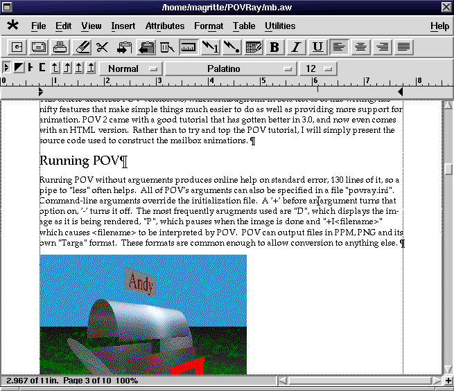 Applix Words is a full-featured word processor with everything you'd expect to find in a modern product. That is, unless you're looking to do something which really should be done using desktop publishing software. By the way, one thing you never want to do with it is embed, oh, 80 or so large, 256-color GIFs in a single document--at somewhere around 8MB, application behavior gets a bit wacky. Linking is much, much better.