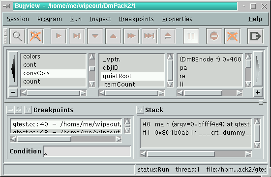 At the beginning there was just the idea to have some nice and easy to use frontends for the main development tools of each C++-programmer under Linux: gcc, gdb and make. We decided to use wxWindows [1] by Julian Smart to program the GUI. The first versions of WipeOut were developed with the OpenLook-variant of wxWindows. Later we changed to wxXt by Marcus Holzem because most of the people didn't like OpenLook. For basic data structures (container classes, strings, etc.) we developed dmpack [2]. This library contains also features such as streamable objects and remote method invocation, which are very important to the communication between the various WipeOut components. The communication part of dmpack is based on the socket++-library by Gnanasekaran Swaminathan which provides an object-oriented interface to sockets and pipes.