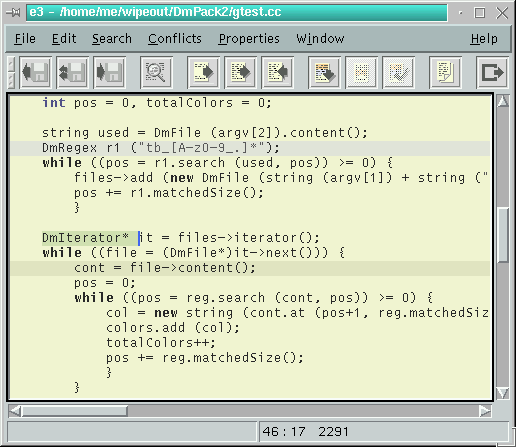 The highlighting of syntactical elements increases the readability of source code. The WipeOut-editor uses regular expressions to do that. The syntax is similar to the 'grep'-command. The documentation of WipeOut contains a general overview of the meta-symbols. This kind of highlighting slows down the editor a little bit but it gives you the flexibility to create your own highlighting style.