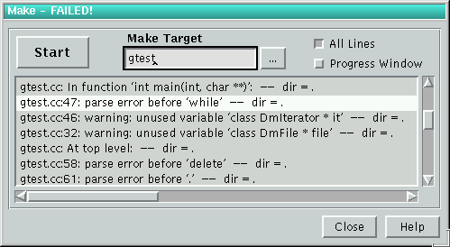 To start make we open the Make-Shell with the 5th button of the Project Browser. This dialog has only a few elements: the Start-button to start make, an edit field to set a special target (an empty field means the default target - 'cplusplus') and two checkboxes. Normally Make-Shell shows only compiler errors and warnings in the lower listbox after make has finished. If we check 'All Lines', we get all the make output in the listbox. If we check Progress Window, a small output console opens while compiling and shows the original make output.