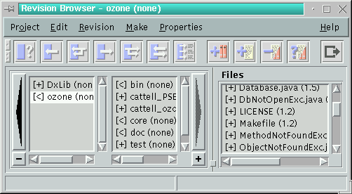 The Revision Browser shows this hierarchy in a GUI-element called browser box. This box was inspired by a similar GUI-element of the NextStep-System and it's a clever and easy way to display a hierarchy. Each listbox shows one level of the hierarchy. The top of the hierarchy is shown in the most left listbox. If you select an item the listbox to the right contains the children of it. With the arrow buttons to the left and right of the box you can scroll through the hierarchy.