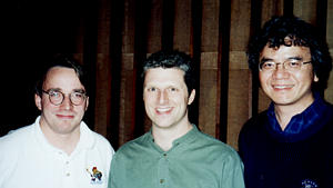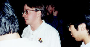 Alpha Processor, Inc., a Samsung company, announced they were joining Linux International, and Guy Ludden presented a check to Jon ``maddog'' Hall. I got the picture and then took several others of Jon, including one with a people-size Tux, who was roaming the show floor.
