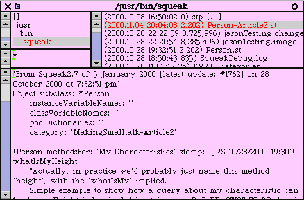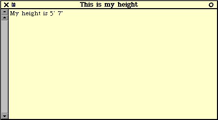 Simple example to show how a query about my characteristic can be done. Ah-ha - notice that the height is not being returned via an instance variable as we guessed at above, but is in fact hardcoded... A BAD PRACTICE TO DO, but is fine for this example to keep things simple, and wanted to show how to do a ' in a string"(Workspace new contents: 'My height is 5'' 7"') openLabel: 'This is my height'! !
