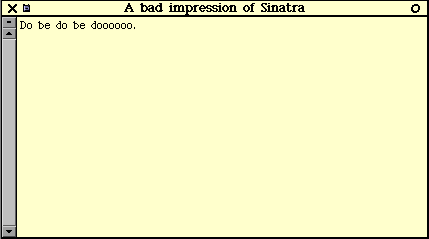 sing"singing method 5 of 6"self mySing: 'Do be do be doooooo.' withTitle: 'A bad impression of Sinatra'