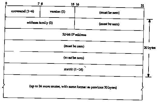 The next 20 bytes specify the address family (which is always 2 for IP addresses), an IP address, and an associated metric. We'll see later in this section that RIP metrics are hop counts.