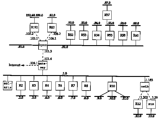 We'll now watch all the unsolicited RIP updates on an Ethernet and see just what RIP sends on a regular basis to its neighbors. Figure 10.7 shows the arrangement of many of the noao.edu networks. We have named the routers Rn for simplicity, where n is the subnet number, except for the ones we use elsewhere in the text. We show the point-to-point links with dashed lines and the IP address at each end of these links.