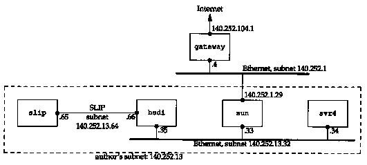 sun | 140.252.1.29 140.252.13.33 | 255.255.255.0 255.255.255.224 | 140.252.1 140.252.13.32 | 1 | on subnet 1 on author's Ethernet |