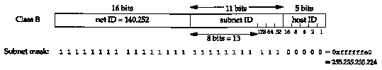 The subnet mask for all the interfaces on the 140.252.13 subnet is 255.255.255.224, or 0xffffffe0. This indicates that the rightmost 5 bits are for the host ID, and the 27 bits to the left are the network ID and subnet ID.
