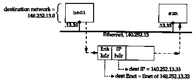 First consider a simple example: our host bsdi has an IP datagram to send to our host sun. Both hosts are on the same Ethernet (see inside front cover). Figure 3.3 shows the delivery of the datagram.