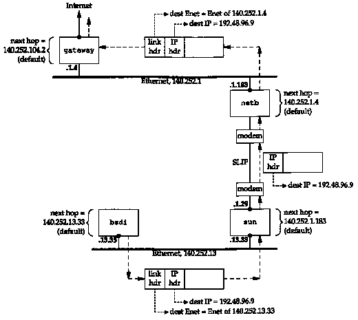 When sun receives the datagram it realizes that the datagram's destination IP address is not one of its own, and sun is configured to act as a router, so it forwards the datagram. Its routing table is searched and the default entry is used. The default entry on sun tells it to send datagrams to the next-hop router netb, whose IP address is 140.252.1.183. The datagram is sent across the point-to-point SLIP link, using the minimal encapsulation we showed in Figure 2.2. We don't show a link-layer header, as we do on the Ethernets, because there isn't one on a SLIP link.