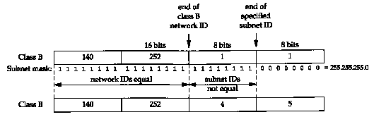 After obtaining an IP network ID of a certain class from the InterNIC, it is up to the local system administrator whether to subnet or not, and if so, how many bits to allocate to the subnet ID and host ID. For example, the internet used in this text has a class B network address (140.252) and of the remaining 16 bits, 8 are for the subnet ID and 8 for the host ID. This is shown in Figure 3.5.