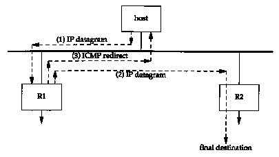The ICMP redirect error is sent by a router to the sender of an IP datagram when the datagram should have been sent to a different router. The concept is simple, as we show in the three steps in Figure 9.3. The only time we'll see an ICMP redirect is when the host has a choice of routers to send the packet to. (Recall the earlier example of this we saw in Figure 7.6.)