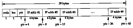 Code is a I-byte field specifying the type of IP option. For the RR option its value is 7. Len is the total number of bytes of the RR option, which in this case is 39. (Although it's possible to specify an RR option with less than the maximum size, ping always provides a 39-byte option field, to record up to nine IP addresses. Given the limited room in the IP header for options, it doesn't make sense to specify a size less than the maximum.)