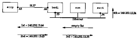 The problem is that aix does not know to send IP datagrams destined for the subnet 140.252.13 to netb. Instead, aix has a default entry in its routing table that tells it to send all datagrams to the router gateway if it doesn't have a particular route for the destination. The router gateway has more routing knowledge than any of the hosts on the 140.252.1 subnet. (There are more than 150 hosts on this Ethernet and instead of running a routing daemon on every one, each has a "default" entry that points to the router gateway.)