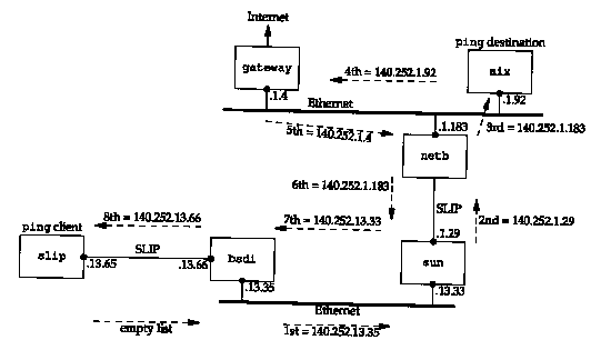 Let's run an example of the RR option with the ping program. We'll run ping on the host svr4 to the host slip. One intermediate router (bsdi) will handle the datagram. The following output is from svr4: