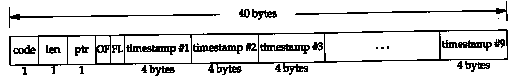 The code field is 0x44 for the timestamp option. The two fields len and ptr are the same as for the record route option: the total length of the option (normally 36 or 40) and a pointer to the next available entry (5,9, 13, etc.).